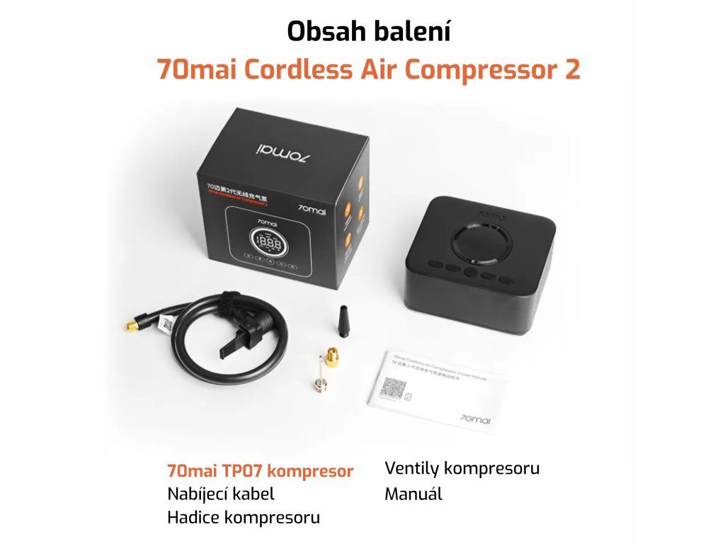 Nabíjecí kompresor 70mai Cordless Air Compressor 2 je díky svým malým rozměrům a dvěma bateriím mobilní pomocník na cesty. Dohuštění pneumatik u vozu či kola nebo nafoukání balónu je pro tento kompresor hračka. Překvapí Vás síla 10,3 baru (150 psi), která umožňuje nafouknutí pneumatik během pár minut, a hadice pro kompresor dlouhá 60 cm. Balení obsahuje také nabíjecí adaptér do zapalování auta.