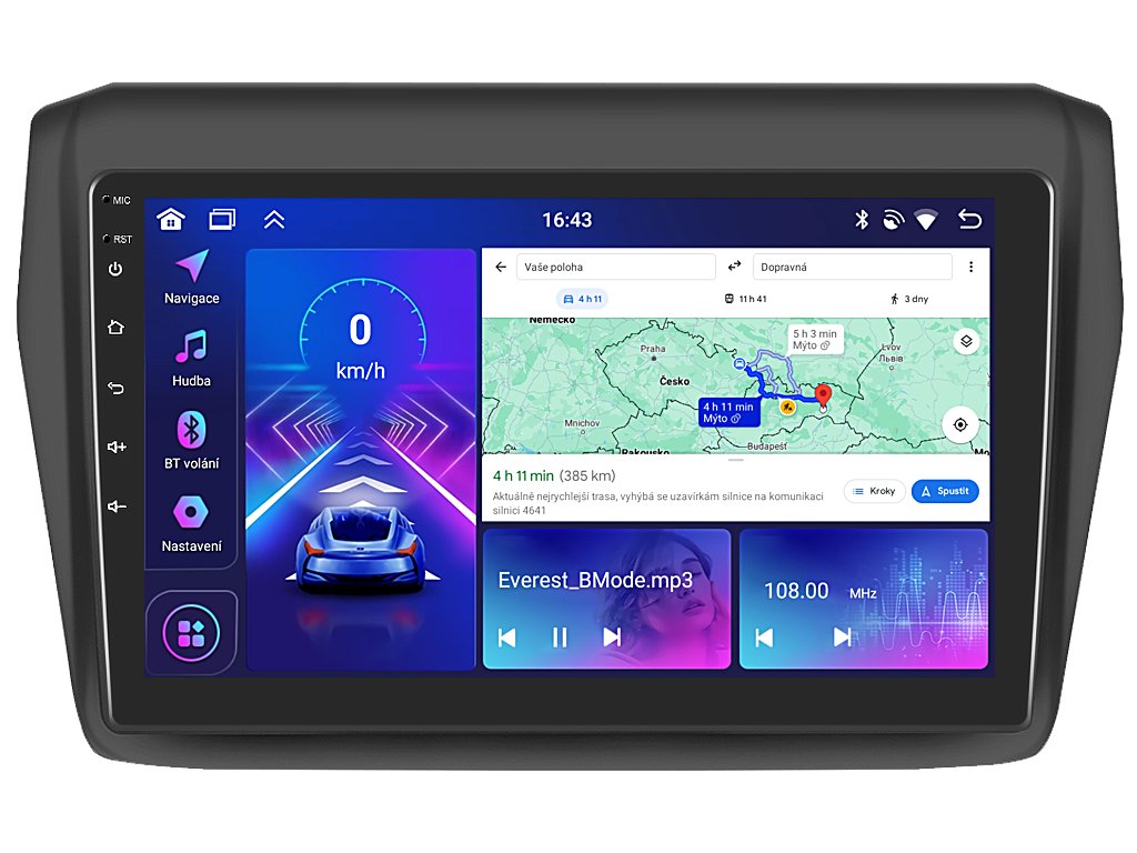 Zažijte každý okamžik ve vašem Suzuki Swift III (Gen 5) s neuvěřitelným zvukem díky 2DIN autorádiu Bmode BEV67. Na první pohled upoutá moderní technologie CarPlay a AndroidAuto, které umožňují bezproblémové zrcadlení a ovládání telefonu na displeji autorádia. Jeho 9 palcová dotyková obrazovka zachycuje každý detail v HD rozlišení, což potěší spolucestující při cestování. Vysoký výkon zajistí čtyřjádrový procesor s podporou 4 GB RAM. Náročný posluchač jistě ocení funkci DSP neboli digitální signálový procesor, který násobně zvyšuje kvalitu reprodukce. Funkce Bluetooth umožní pohodlné a bezpečné handsfree volání a vyřizování důležitých hovorů. Pokud si občas nevíte rady se správnou cestou, můžete využít zabudovaného GPS modulu, který Vás přivede na tu správnou cestu. Pomocí Google obchodu si můžete stáhnout svou oblíbenou GPS navigaci. Operační systém Android 15 se postará o ovládání mnoha oblíbených aplikací. Pro bezpečné couvání můžete snadno propojit autorádio s parkovací kamerou. Autorádio nabízí možnost výběru z různých jazyků, které obsahují přeloženou základní část systému do českého jazyka.