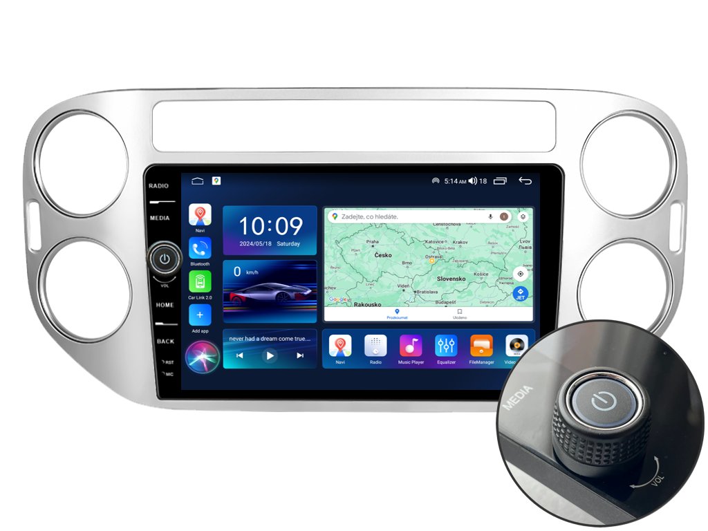 2DIN autorádio Everest EVE14 pro Volkswagen Tiguan nastavuje nové standardy ve světě multimediálních technologií. Na první pohled zaujme svou 9 palcovou QLED obrazovkou s neuvěřitelným rozlišením 1280 x 800. Lze na ní sledovat video i prohlížet fotografie s podporou Android aplikacemi. O špičkový výkon a plynulý běh aplikací se stará stabilní software s 8-jádrovým procesorem ve spolupráci se 6 GB RAM. Náročný posluchač jistě ocení funkci DSP neboli digitální signálový procesor, který násobně zvyšuje kvalitu reprodukce. Za pomocí 4G modulu se z Vašeho autorádia stane smartphone, ze kterého můžete hravě odesílat SMS zprávy, využívat online GPS navigaci s aktuální dopravní situací či využívat další cenné funkce. Váš mobilní telefon již zůstane navždy v kapse díky bezdrátové funkci CarPlay a Android Auto. Díky operačnímu systému Android 14 budete mít ve svém automobilu kompletní multimediální centrum přeplněné funkcemi a aplikacemi. Pohled z parkovací kamery Vám umožní bezpečné a ničím nerušené couvání. Autorádio nabízí možnost výběru z různých jazyků, které obsahují přeloženou základní část systému do českého jazyka.