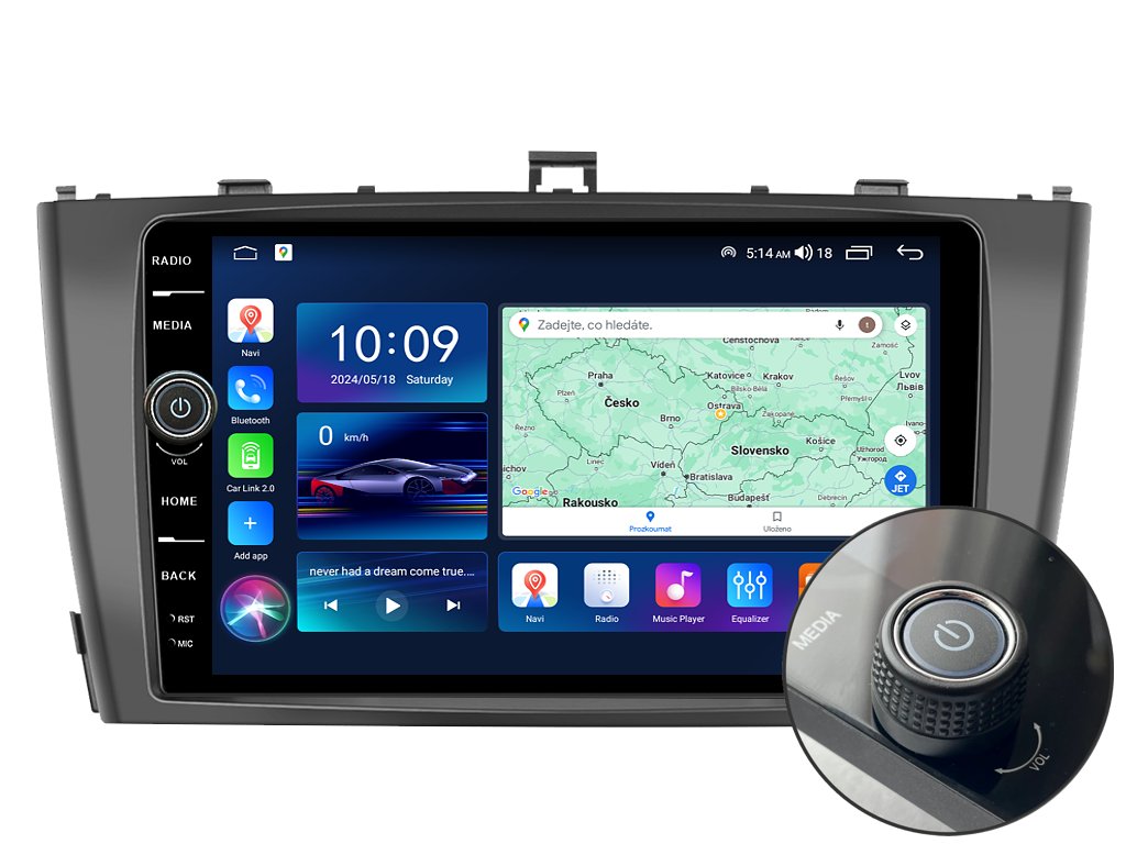 2DIN autorádio Everest EVE33 pro Toyota Avensis nastavuje nové standardy ve světě multimediálních technologií. Na první pohled zaujme svou 9 palcovou QLED obrazovkou s neuvěřitelným rozlišením 1280 x 800. Lze na ní sledovat video i prohlížet fotografie s podporou Android aplikacemi. O špičkový výkon a plynulý běh aplikací se stará stabilní software s 8-jádrovým procesorem ve spolupráci se 6 GB RAM. Náročný posluchač jistě ocení funkci DSP neboli digitální signálový procesor, který násobně zvyšuje kvalitu reprodukce. Za pomocí 4G modulu se z Vašeho autorádia stane smartphone, ze kterého můžete hravě odesílat SMS zprávy, využívat online GPS navigaci s aktuální dopravní situací či využívat další cenné funkce. Váš mobilní telefon již zůstane navždy v kapse díky bezdrátové funkci CarPlay a Android Auto. Díky operačnímu systému Android 14 budete mít ve svém automobilu kompletní multimediální centrum přeplněné funkcemi a aplikacemi. Pohled z parkovací kamery Vám umožní bezpečné a ničím nerušené couvání. Autorádio nabízí možnost výběru z různých jazyků, které obsahují přeloženou základní část systému do českého jazyka.