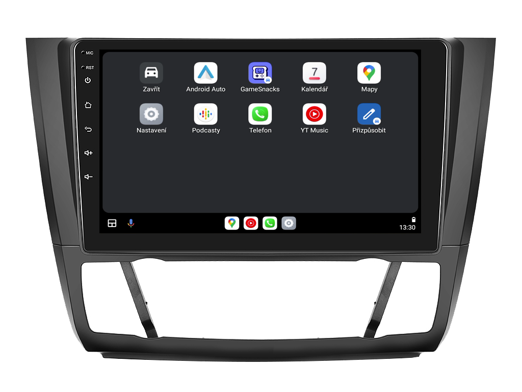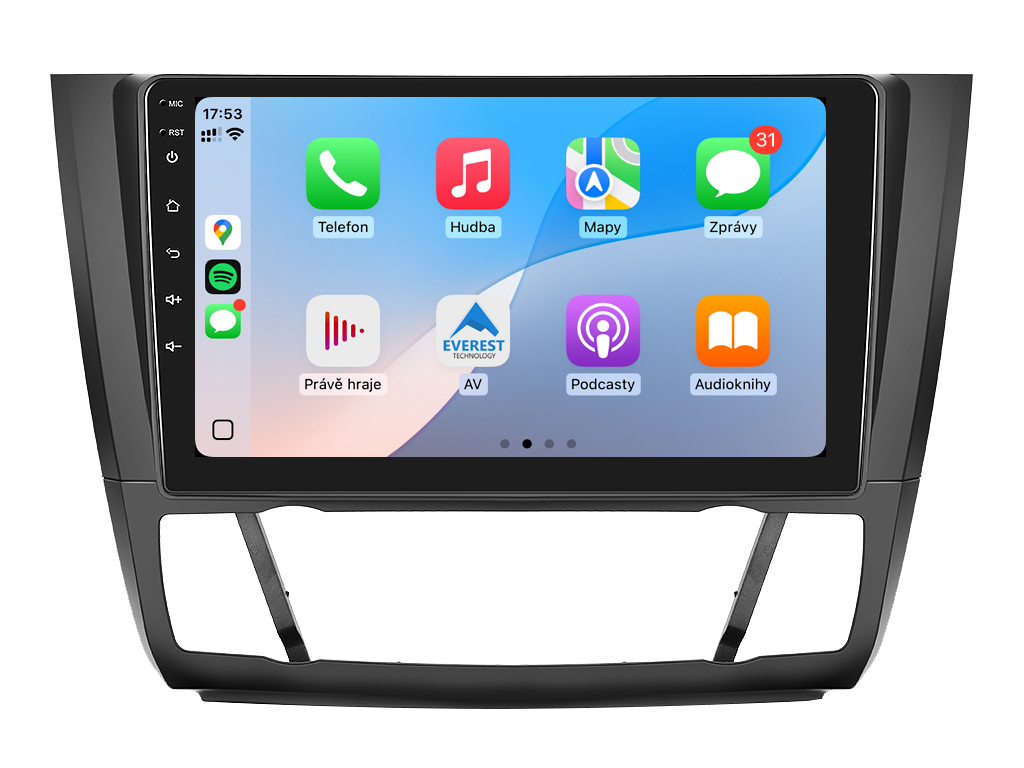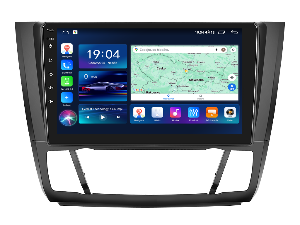2DIN autorádio Everest EVT19 pro BMW E81 / E82 / E87 / E88 nastavuje nové standardy ve světě multimediálních technologií. Na první pohled zaujme svou 9 palcovou QLED obrazovkou s neuvěřitelným rozlišením 1280 x 800. Lze na ní sledovat video i prohlížet fotografie s podporou Android aplikacemi. O špičkový výkon a plynulý běh aplikací se stará stabilní software s 8-jádrovým procesorem ve spolupráci se 6 GB RAM. Náročný posluchač jistě ocení funkci DSP neboli digitální signálový procesor, který násobně zvyšuje kvalitu reprodukce. Za pomocí 4G modulu se z Vašeho autorádia stane smartphone, ze kterého můžete hravě odesílat SMS zprávy, využívat online GPS navigaci s aktuální dopravní situací či využívat další cenné funkce. Váš mobilní telefon již zůstane navždy v kapse díky bezdrátové funkci CarPlay a Android Auto. Díky operačnímu systému Android 15 budete mít ve svém automobilu kompletní multimediální centrum přeplněné funkcemi a aplikacemi. Pohled z parkovací kamery Vám umožní bezpečné a ničím nerušené couvání. Autorádio nabízí možnost výběru z různých jazyků, které obsahují přeloženou základní část systému do českého jazyka.
