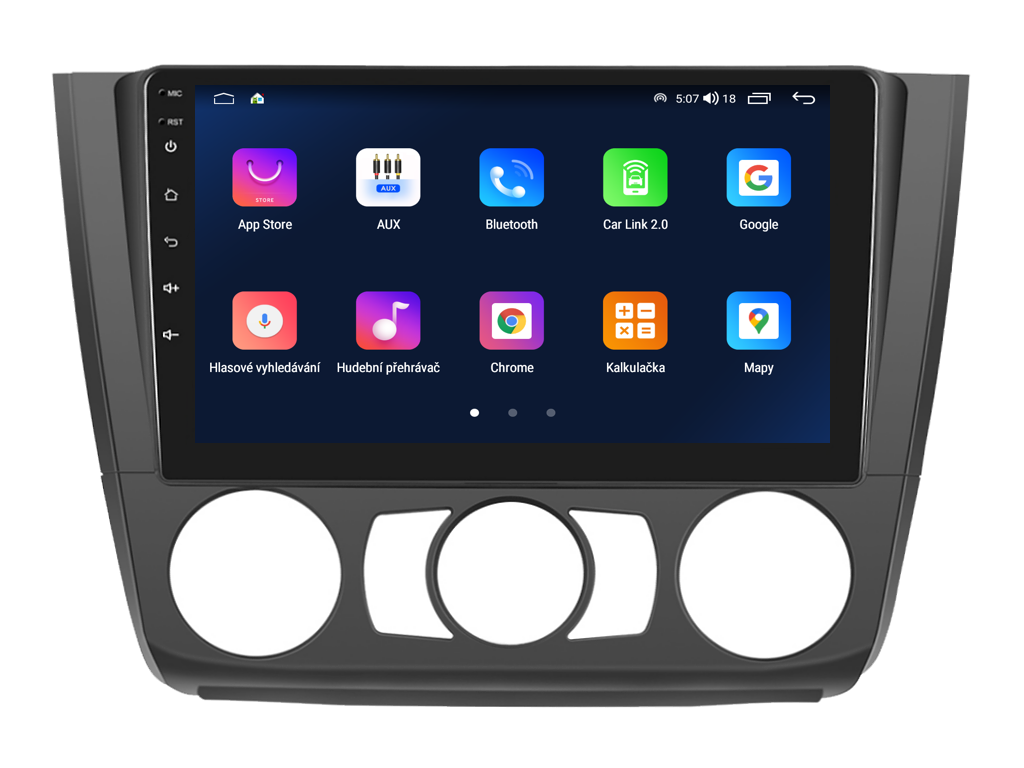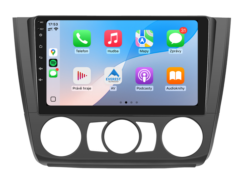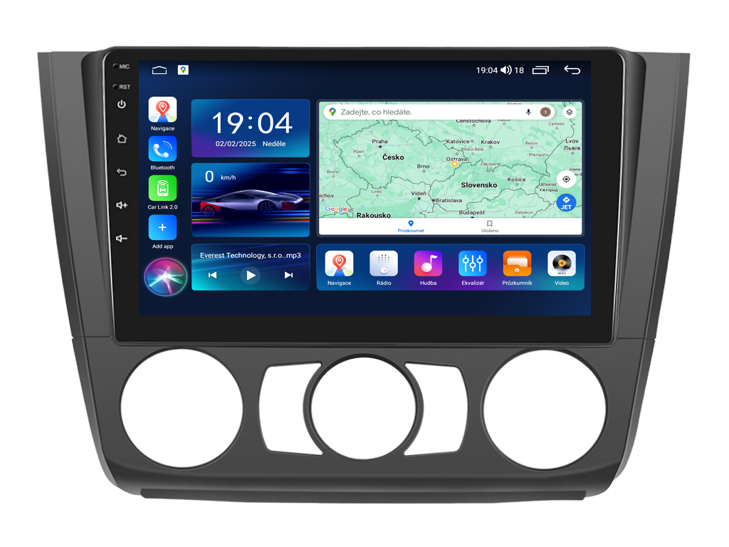 2DIN autorádio Everest EVT20 pro BMW E81 / E82 / E87 / E88 nastavuje nové standardy ve světě multimediálních technologií. Na první pohled zaujme svou 9 palcovou QLED obrazovkou s neuvěřitelným rozlišením 1280 x 800. Lze na ní sledovat video i prohlížet fotografie s podporou Android aplikacemi. O špičkový výkon a plynulý běh aplikací se stará stabilní software s 8-jádrovým procesorem ve spolupráci se 6 GB RAM. Náročný posluchač jistě ocení funkci DSP neboli digitální signálový procesor, který násobně zvyšuje kvalitu reprodukce. Za pomocí 4G modulu se z Vašeho autorádia stane smartphone, ze kterého můžete hravě odesílat SMS zprávy, využívat online GPS navigaci s aktuální dopravní situací či využívat další cenné funkce. Váš mobilní telefon již zůstane navždy v kapse díky bezdrátové funkci CarPlay a Android Auto. Díky operačnímu systému Android 15 budete mít ve svém automobilu kompletní multimediální centrum přeplněné funkcemi a aplikacemi. Pohled z parkovací kamery Vám umožní bezpečné a ničím nerušené couvání. Autorádio nabízí možnost výběru z různých jazyků, které obsahují přeloženou základní část systému do českého jazyka.