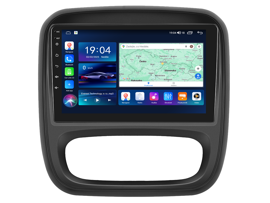 2DIN autorádio Everest EVT26 pro Renault Trafic III nebo Opel Vivaro B nastavuje nové standardy ve světě multimediálních technologií. Na první pohled zaujme svou 9 palcovou QLED obrazovkou s neuvěřitelným rozlišením 1280 x 800. Lze na ní sledovat video i prohlížet fotografie s podporou Android aplikacemi. O špičkový výkon a plynulý běh aplikací se stará stabilní software s 8-jádrovým procesorem ve spolupráci se 6 GB RAM. Náročný posluchač jistě ocení funkci DSP neboli digitální signálový procesor, který násobně zvyšuje kvalitu reprodukce. Za pomocí 4G modulu se z Vašeho autorádia stane smartphone, ze kterého můžete hravě odesílat SMS zprávy, využívat online GPS navigaci s aktuální dopravní situací či využívat další cenné funkce. Váš mobilní telefon již zůstane navždy v kapse díky bezdrátové funkci CarPlay a Android Auto. Díky operačnímu systému Android 15 budete mít ve svém automobilu kompletní multimediální centrum přeplněné funkcemi a aplikacemi. Pohled z parkovací kamery Vám umožní bezpečné a ničím nerušené couvání. Autorádio nabízí možnost výběru z různých jazyků, které obsahují přeloženou základní část systému do českého jazyka.