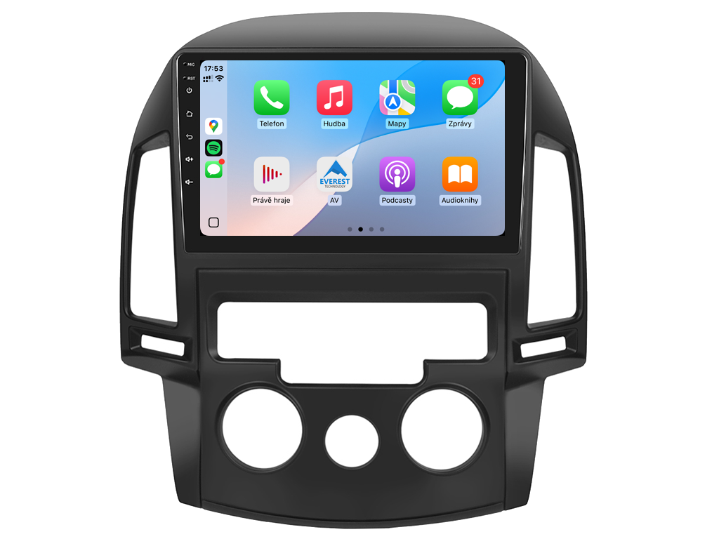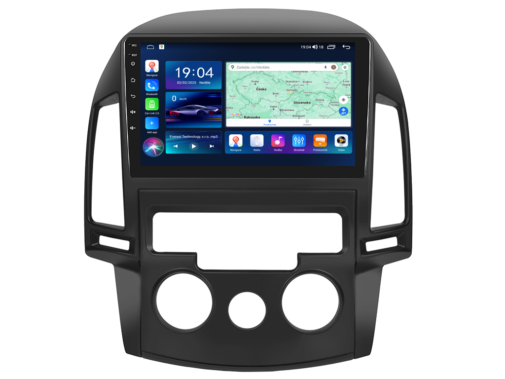 2DIN autorádio Everest EVT32 pro Hyundai i30 nastavuje nové standardy ve světě multimediálních technologií. Na první pohled zaujme svou 9 palcovou QLED obrazovkou s neuvěřitelným rozlišením 1280 x 800. Lze na ní sledovat video i prohlížet fotografie s podporou Android aplikacemi. O špičkový výkon a plynulý běh aplikací se stará stabilní software s 8-jádrovým procesorem ve spolupráci se 6 GB RAM. Náročný posluchač jistě ocení funkci DSP neboli digitální signálový procesor, který násobně zvyšuje kvalitu reprodukce. Za pomocí 4G modulu se z Vašeho autorádia stane smartphone, ze kterého můžete hravě odesílat SMS zprávy, využívat online GPS navigaci s aktuální dopravní situací či využívat další cenné funkce. Váš mobilní telefon již zůstane navždy v kapse díky bezdrátové funkci CarPlay a Android Auto. Díky operačnímu systému Android 15 budete mít ve svém automobilu kompletní multimediální centrum přeplněné funkcemi a aplikacemi. Pohled z parkovací kamery Vám umožní bezpečné a ničím nerušené couvání. Autorádio nabízí možnost výběru z různých jazyků, které obsahují přeloženou základní část systému do českého jazyka.