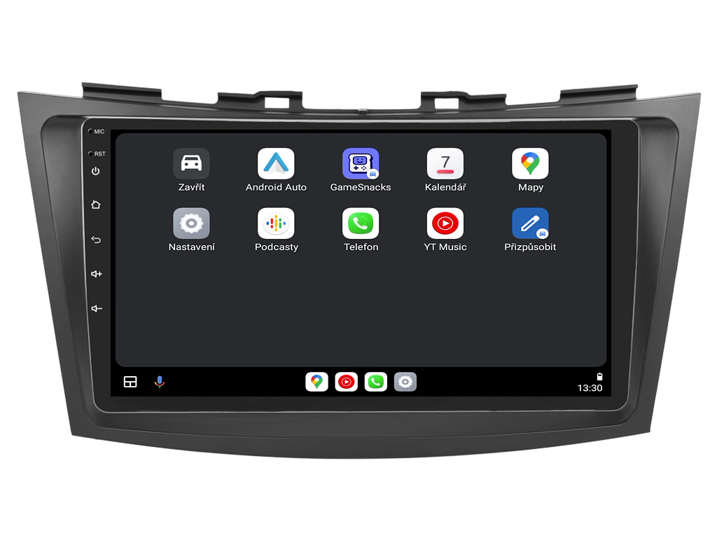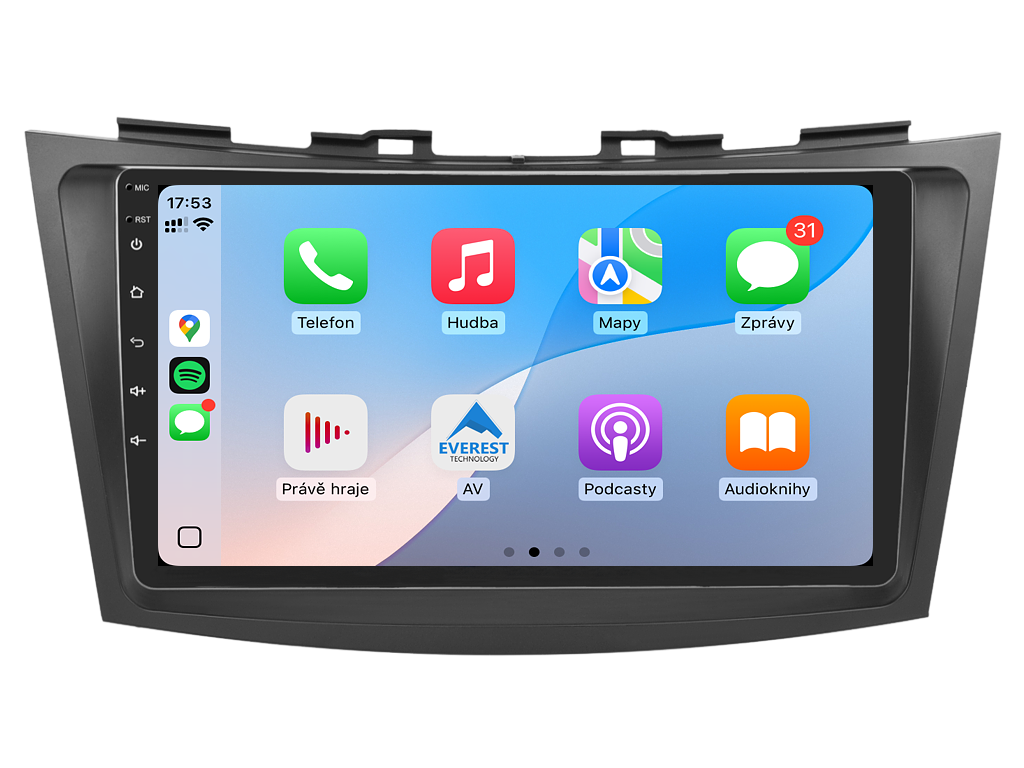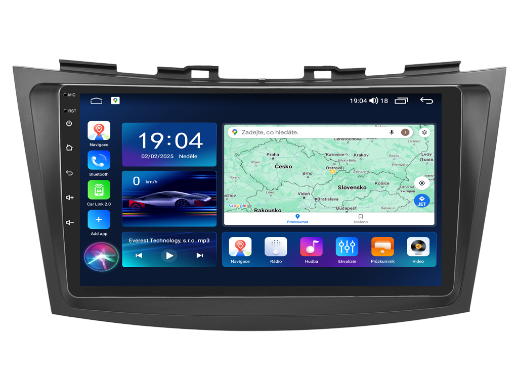 2DIN autorádio Everest EVT48 pro Suzuki Swift II (Gen 4) nastavuje nové standardy ve světě multimediálních technologií. Na první pohled zaujme svou 9 palcovou QLED obrazovkou s neuvěřitelným rozlišením 1280 x 800. Lze na ní sledovat video i prohlížet fotografie s podporou Android aplikacemi. O špičkový výkon a plynulý běh aplikací se stará stabilní software s 8-jádrovým procesorem ve spolupráci se 6 GB RAM. Náročný posluchač jistě ocení funkci DSP neboli digitální signálový procesor, který násobně zvyšuje kvalitu reprodukce. Za pomocí 4G modulu se z Vašeho autorádia stane smartphone, ze kterého můžete hravě odesílat SMS zprávy, využívat online GPS navigaci s aktuální dopravní situací či využívat další cenné funkce. Váš mobilní telefon již zůstane navždy v kapse díky bezdrátové funkci CarPlay a Android Auto. Díky operačnímu systému Android 15 budete mít ve svém automobilu kompletní multimediální centrum přeplněné funkcemi a aplikacemi. Pohled z parkovací kamery Vám umožní bezpečné a ničím nerušené couvání. Autorádio nabízí možnost výběru z různých jazyků, které obsahují přeloženou základní část systému do českého jazyka.