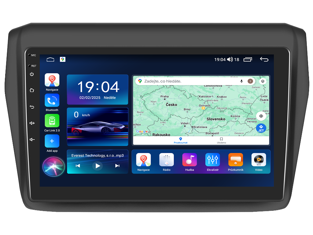2DIN autorádio Everest EVT66 pro Suzuki Swift III (Gen 5) nastavuje nové standardy ve světě multimediálních technologií. Na první pohled zaujme svou 9 palcovou QLED obrazovkou s neuvěřitelným rozlišením 1280 x 800. Lze na ní sledovat video i prohlížet fotografie s podporou Android aplikacemi. O špičkový výkon a plynulý běh aplikací se stará stabilní software s 8-jádrovým procesorem ve spolupráci se 6 GB RAM. Náročný posluchač jistě ocení funkci DSP neboli digitální signálový procesor, který násobně zvyšuje kvalitu reprodukce. Za pomocí 4G modulu se z Vašeho autorádia stane smartphone, ze kterého můžete hravě odesílat SMS zprávy, využívat online GPS navigaci s aktuální dopravní situací či využívat další cenné funkce. Váš mobilní telefon již zůstane navždy v kapse díky bezdrátové funkci CarPlay a Android Auto. Díky operačnímu systému Android 15 budete mít ve svém automobilu kompletní multimediální centrum přeplněné funkcemi a aplikacemi. Pohled z parkovací kamery Vám umožní bezpečné a ničím nerušené couvání. Autorádio nabízí možnost výběru z různých jazyků, které obsahují přeloženou základní část systému do českého jazyka.