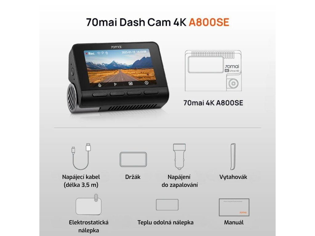 Kameru nabízíme ve verzi se zadní kamerou 70mai 4K A800SE set.