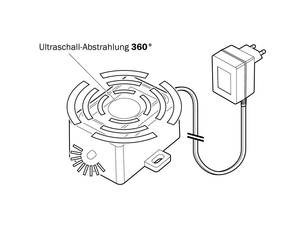 Napájení je z běžné zásuvky. Doporučujeme odpuzovač instalovat na takové místo, kde je volný prostor pro šíření signálů. Ultrazvuk se totiž šíří přímočaře jako světlo, to znamená, že za všemi překážkami nebudou tóny aktivní.
