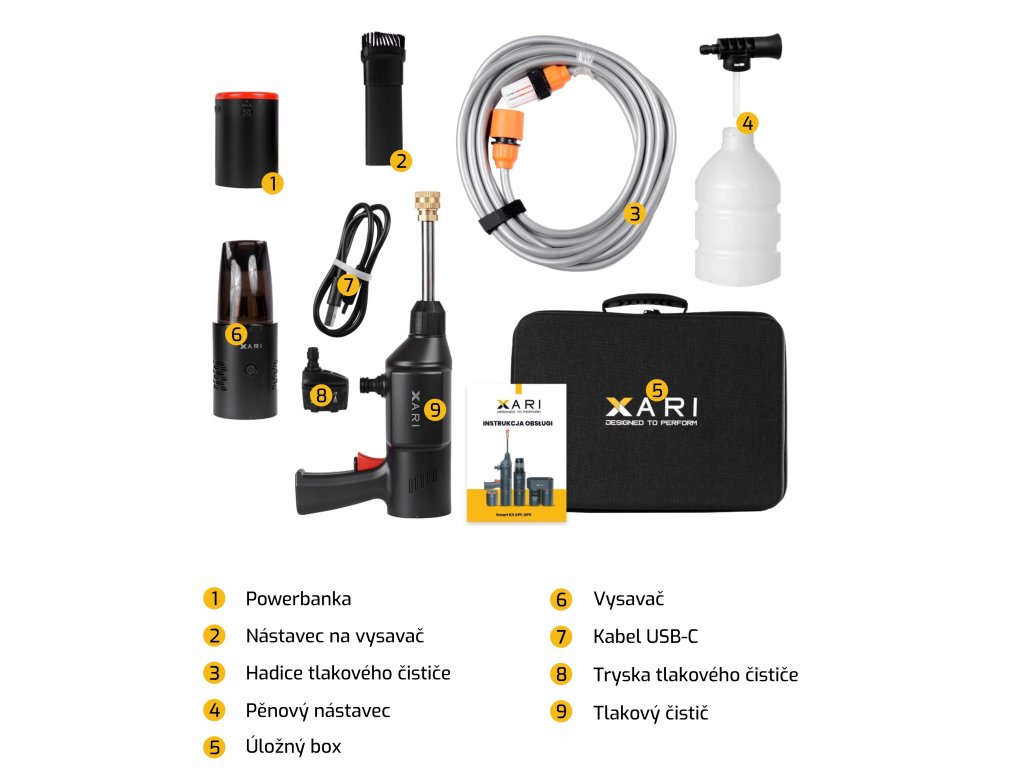 Powerbanka s kapacitou 10 000 mAh napájí všechna zařízení v sadě. Jednoduše sejměte ochranný kroužek z powerbanky a zařízení připojte. Tato kompaktní a přenosná sada je ideální na cesty. Veškeré příslušenství je zabalené v pevném pouzdře. Multifunkční sada Xari XP3 vám umožní umýt auto a vysát jeho interiér. Vysavač a tlakový čistič lze navíc napájet také ze zásuvky zapalovače cigaret v autě (kabel se prodává samostatně).
